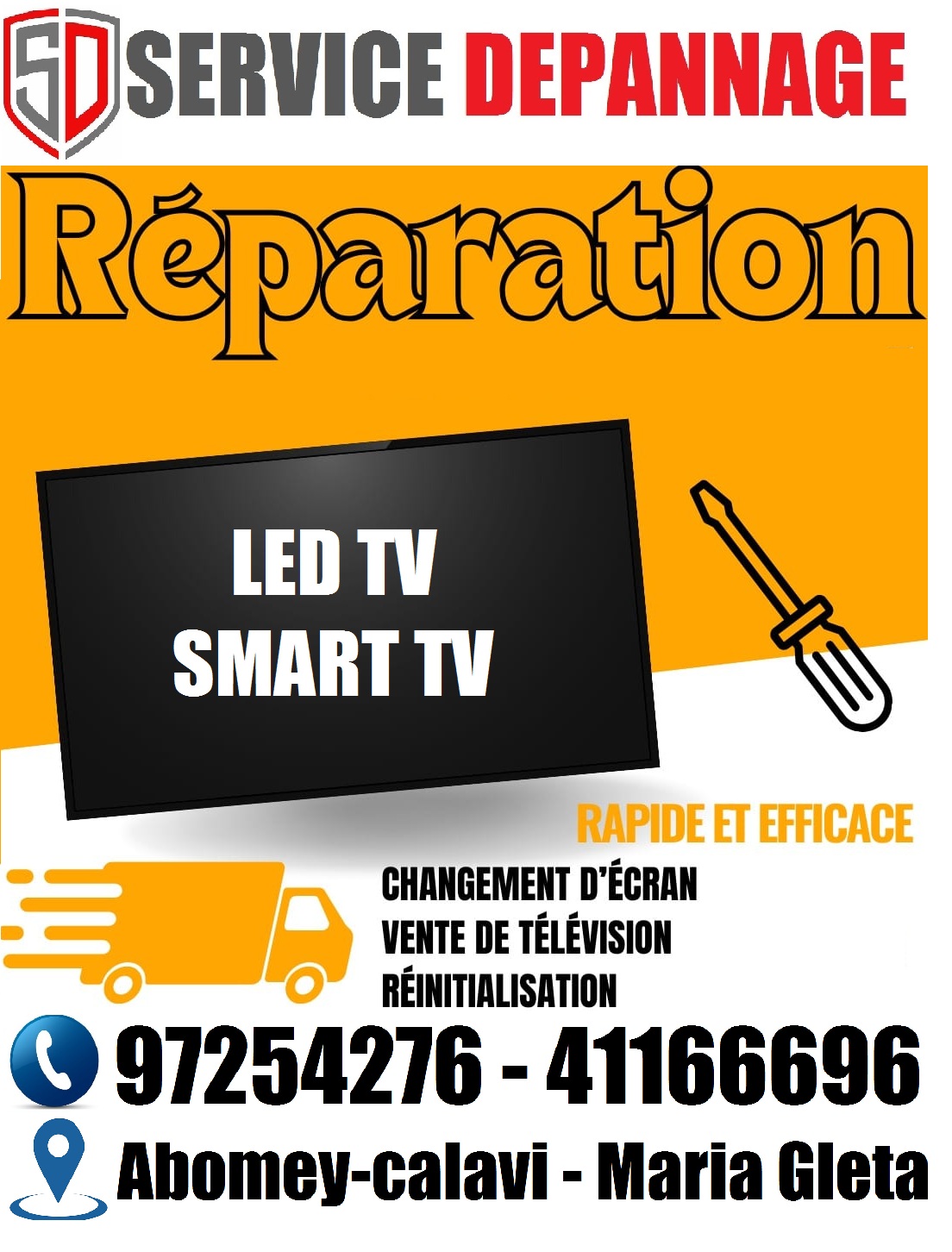 Confiez nous l'installation, et la Réparation, de vos équipements (Électroménagers, Électroniques, Électriques, Informatiques , Domotiques et Robotiques ) : - Téléviseurs LED ; SMART TV ( SAMSUNG, LG,...) - Décodeurs (STRONG, DSTV, TNT, NEW WORLD, STARTIMES, CANAL+, SLTV, REDLINE, SPORT+, BOX ANDROID , IPTV ….) - Caméras Filaire; CAMERA WIFI, CAMERA SOLAIRE ( HIKVISION , DAHUA, ....)- Ordinateurs bureautiques portatifs, Tablettes, portables ..ect..- Réfrigérateur, congélateur, climatiseur, micro-onde, cuisinière, moulinesse, ..ect.. - Clôtures Électriques, et Fils anti intrusion barbelés - systèmes d'Alarme intelligents, Détecteur de mouvement - WiFi ZONE, Connexion haut débit (STARLINK), Répéteur WIFI - Haut-parleur Enceinte encastrable Mural, Plafond, Staff - Spots Luminaires Intérieur et extérieur - Rubans Luminaires Intérieur et extérieur - Appliques Mural Luminaires Intérieurs et extérieurs - Équipements solaires avec optimisation et réduction de la consommation d'énergie.. - Tous travaux d'électricité (Installations des tuyaux câbles et lampes ..etc.. ) Profitez de 10% de réduction sur tous les achats d'équipements et sur les frais d'installation et de réparations des équipements ! Plus d'informations :Appelez nous sur : TEL: +229 0197254276 / +229 0141166696 Ecrivez nous sur Whatsapp : +229 0197254276 / +229 0141166696 site web: https://satellitebenininfo.wixsite.com/benin SATELLITE BÉNIN, Votre partenaire pour un monde numérique écologique