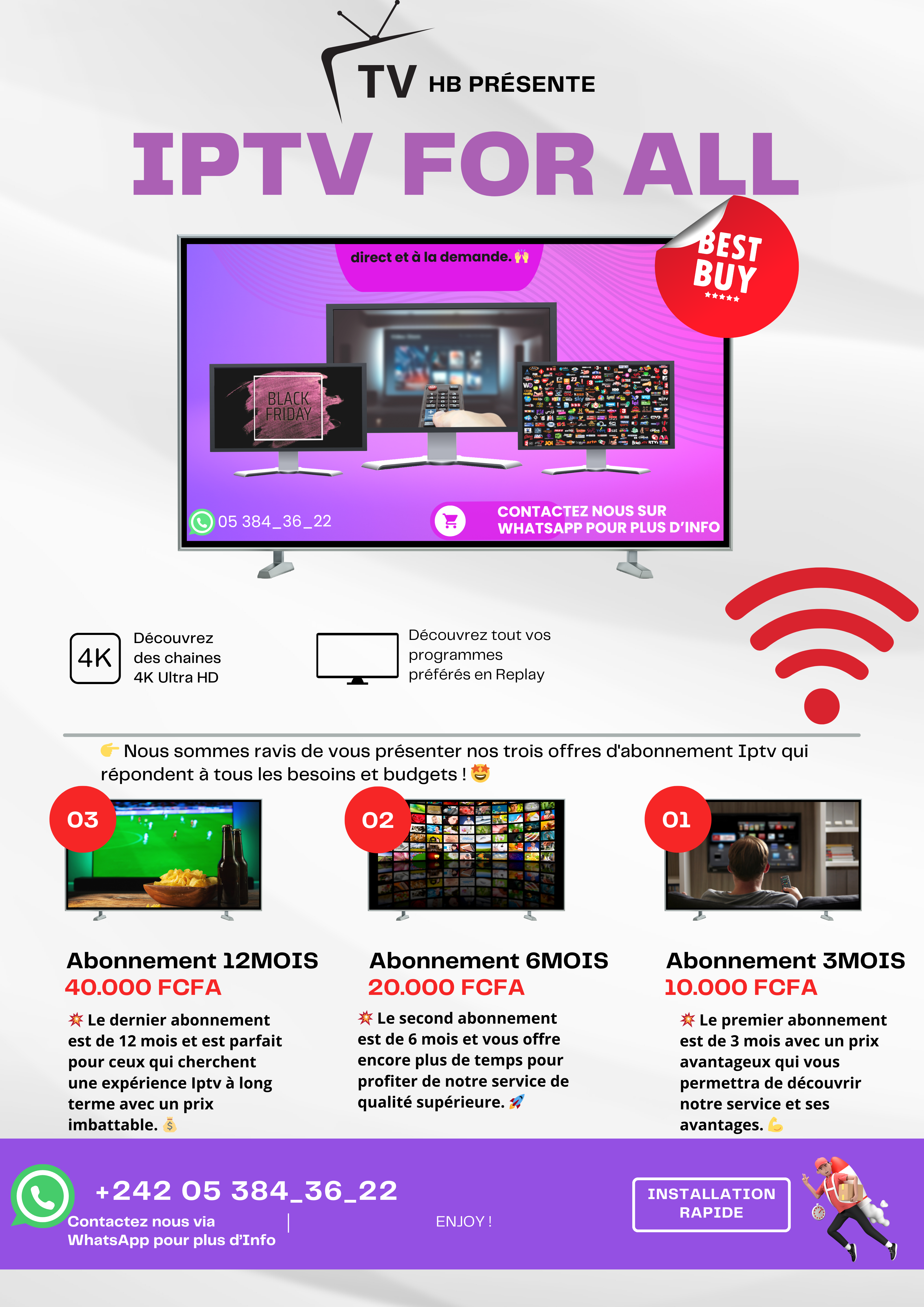 Contactez nous via Whats'App le 053843622 pour profitez de plus de 10.000 chaînes et plus 75.000 Films et Séries Netflix, Amazone prime à prix réduits, tout ce qu'il vous faut c'est une connexion internet et une smart TV.
