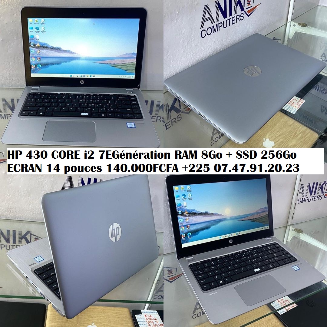 PROMO Rentrée l'ordinateur des élèves et Etudiants !!! HP PROBOOK 430 G4 14pouces 140.000FCFA +225 0747912023 CORE i2 NOUVELLE GÉNÉRATION(7e génération) TRÈS RAPIDE avec son disque SSD de 256GO SSD RAM 8Go WEBCAM WINDOWS 10 PRO 64BITS CARACTÉRISTIQUES PRINCIPALES : Processeur Intel Core i2 2,4 GHz 8 Go de mémoire DDR4 Écran de 14 pouces antireflets avec résolution HD Sortie HDMI, pour la connexion à un téléviseur HD Disque dur SATA SSD : 256Go Carte réseau Ethernet Realtek (10/100/1000) Communication sans fil Wi-Fi AC Clavier résistant aux éclaboussures1 port USB 3.0 + 1 port USB 3.0 Type C Webcam HD 720p Windows 10 Professionnel 64 bits